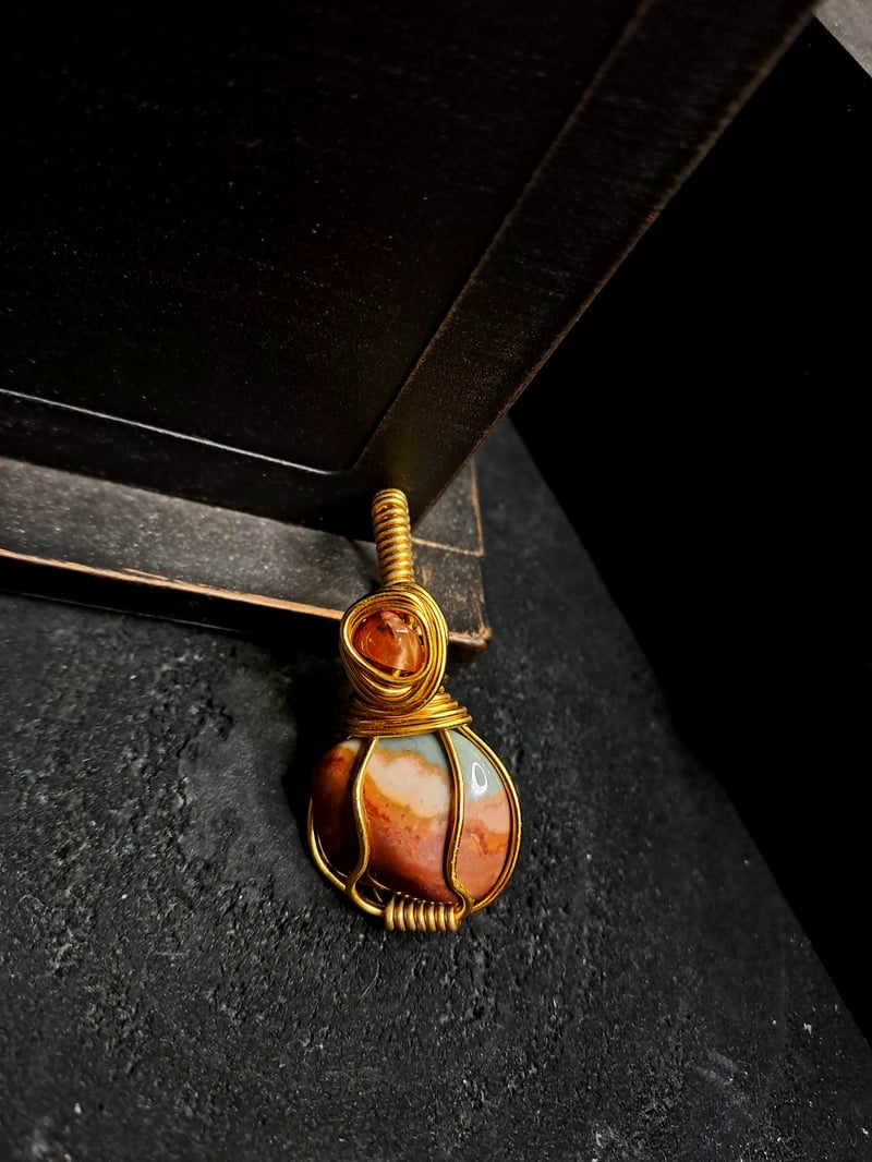 Diaspro policromo con delle meravigliose tonalità che ricordano una spiaggia esotica, come la sabbia che incontra l'acqua del mare, incastonato artigianalmente con filo di alluminio, leggero e anallergico.