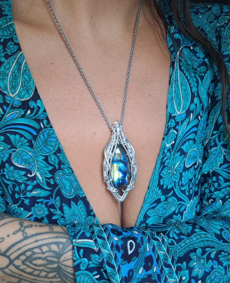 Un ciondolo dallo stile elfico, con intrecci di fili di alluminio che creano la cornice perfetta per questa meravigliosa labradorite, che sembra provenire da un regno magico.