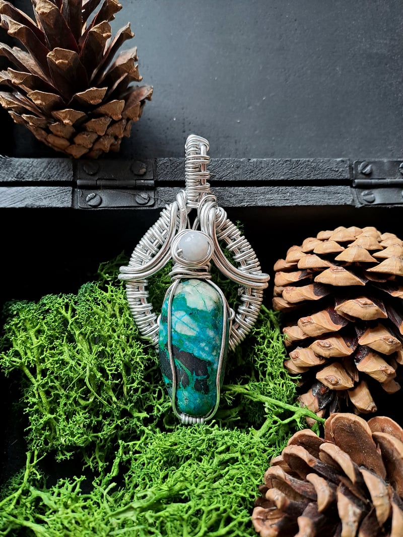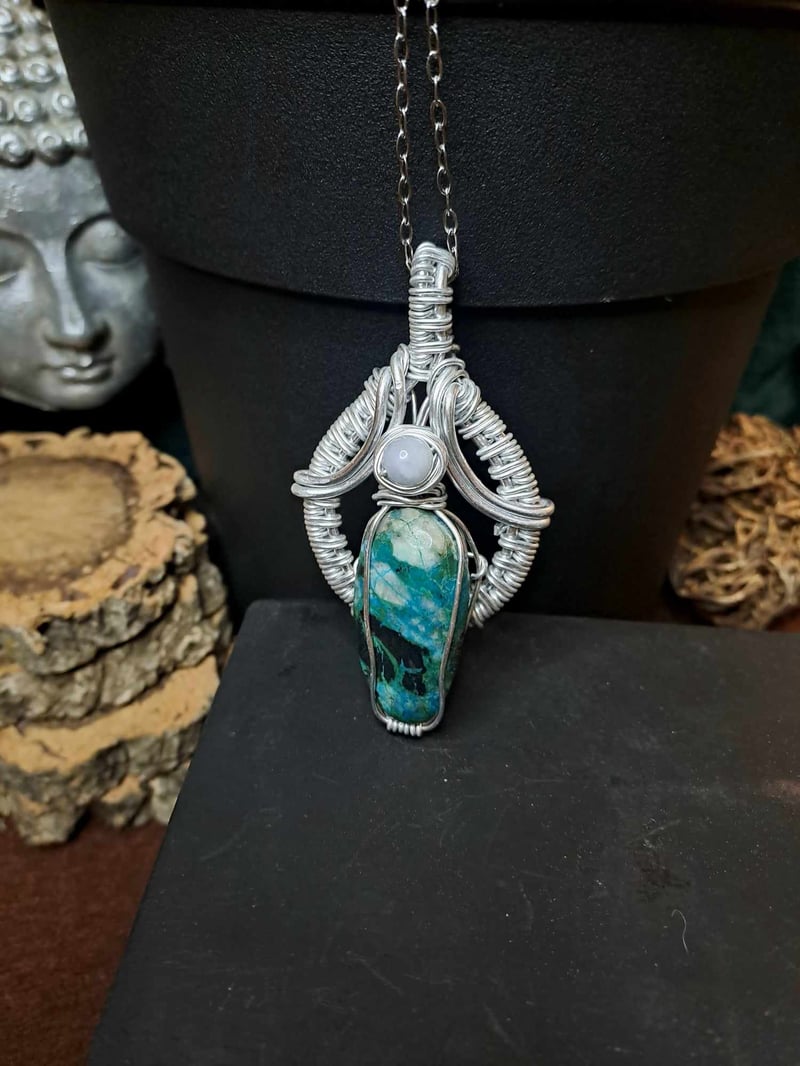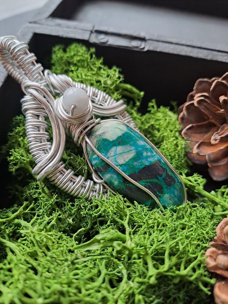 Una meravigliosa crisocolla, con una trama che si lascia osservare per ore, come una terra da scoprire, intrecciata artigianalmente con fili di alluminio argento per creare un trono su cui potersi posare, e un piccolo punto luce per donarle quel pizzico di magia.