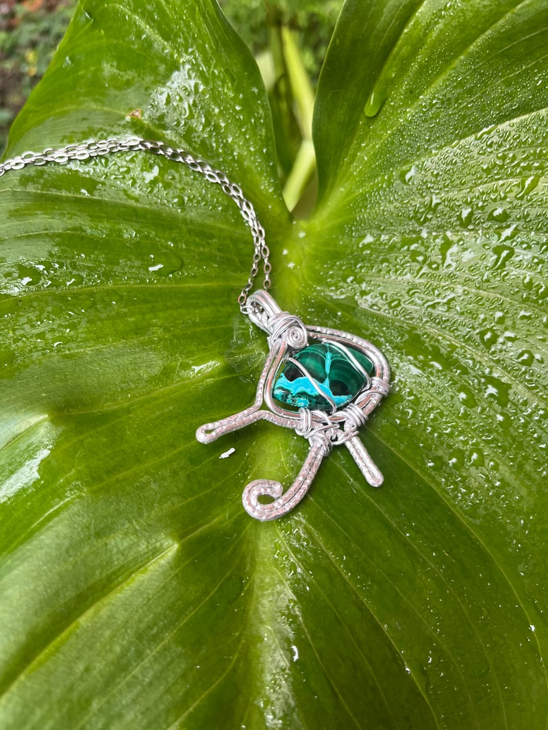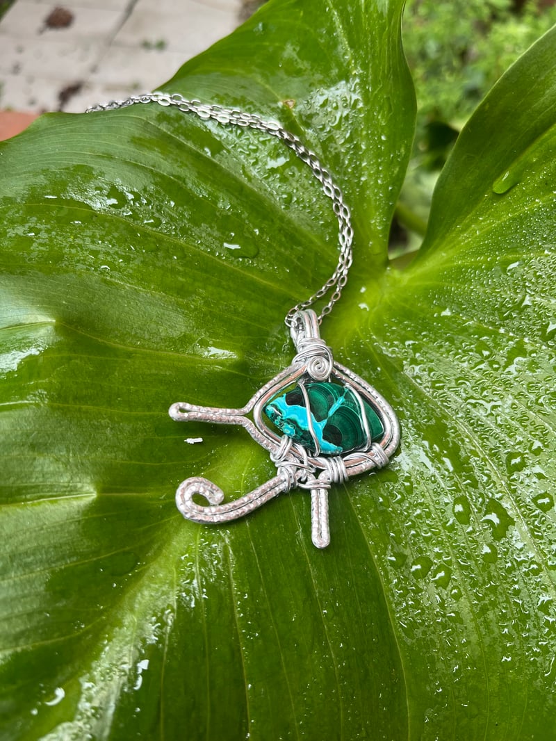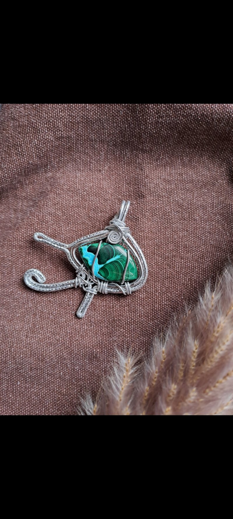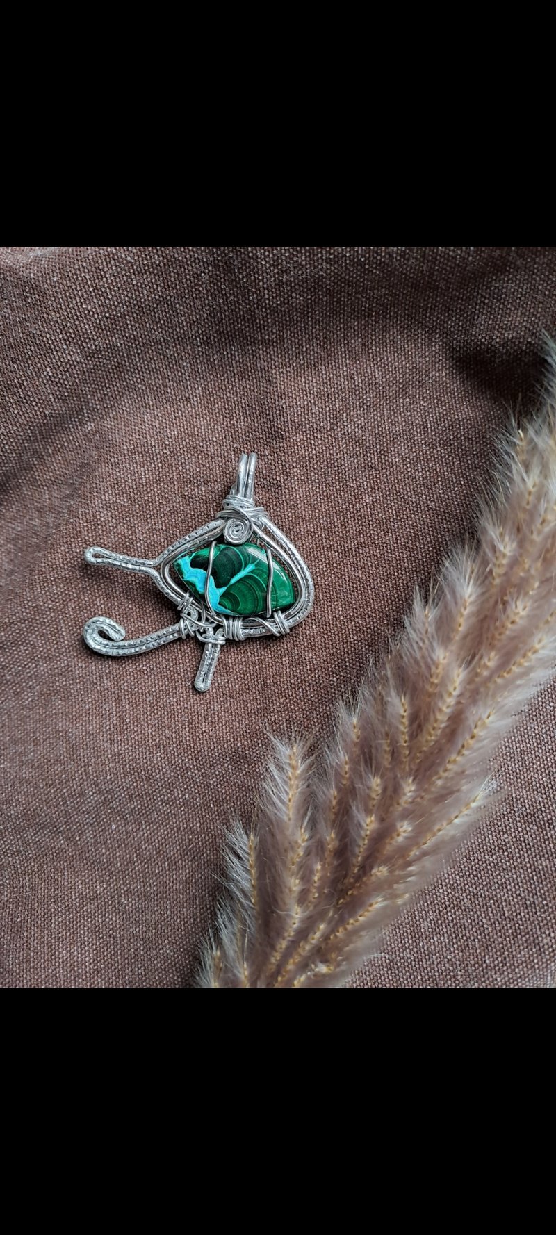 Un simbolo a cui tengo moltissimo: l'occhio di Horus (o di Ra), che incornicia una spettacolare malachite crisocolla.