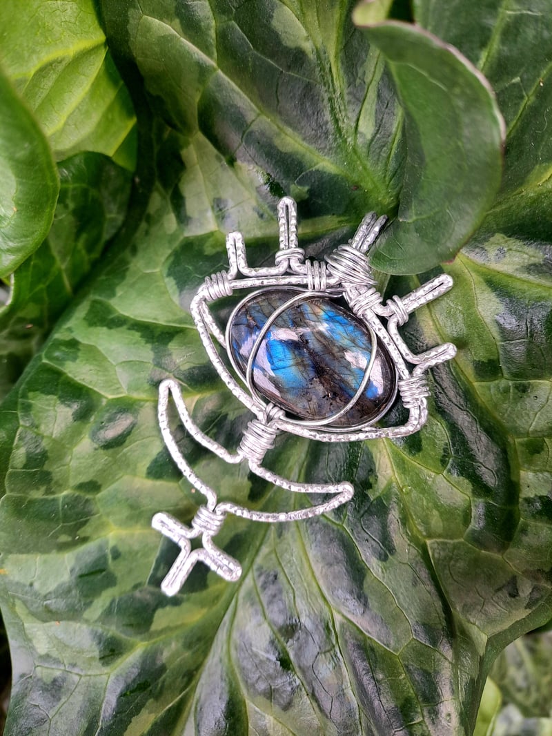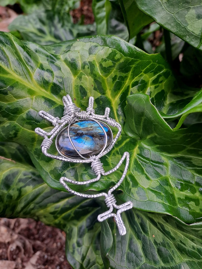 Per questo amuleto ho scelto un design speciale: una mezzaluna realizzata a mano in tecnica wire con una meravigliosa labradorite che esplode di un azzurro intenso.