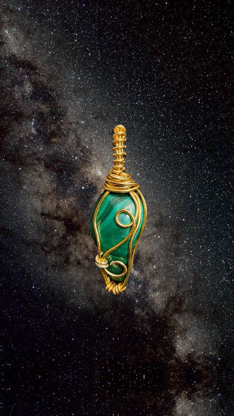 Malachite triangolare incastonata artigianalmente con filo di alluminio dorato, leggero e anallergico.