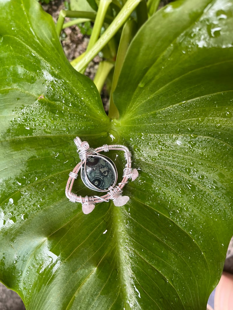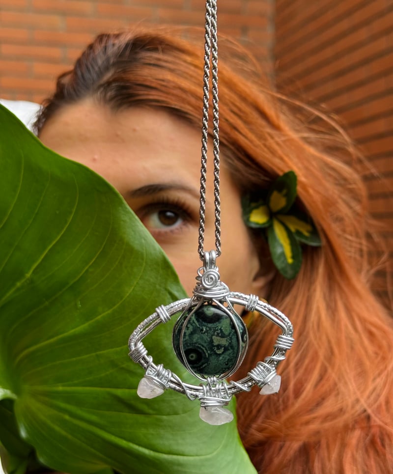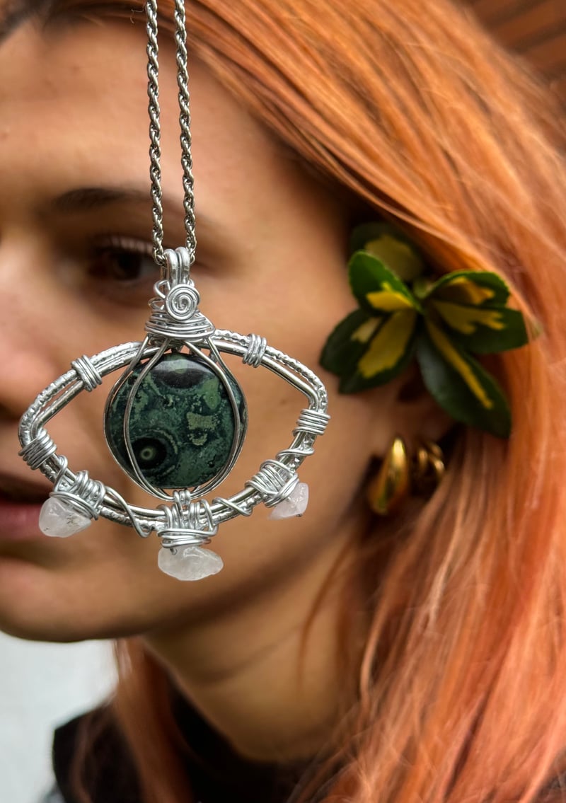 sulla parte inferiore ho aggiunto delle lacrime di quarzo, che portano la sofferenza di chi lo indossa, ma che donano anche luce a questo quadro se guardate dagli occhi giusti.