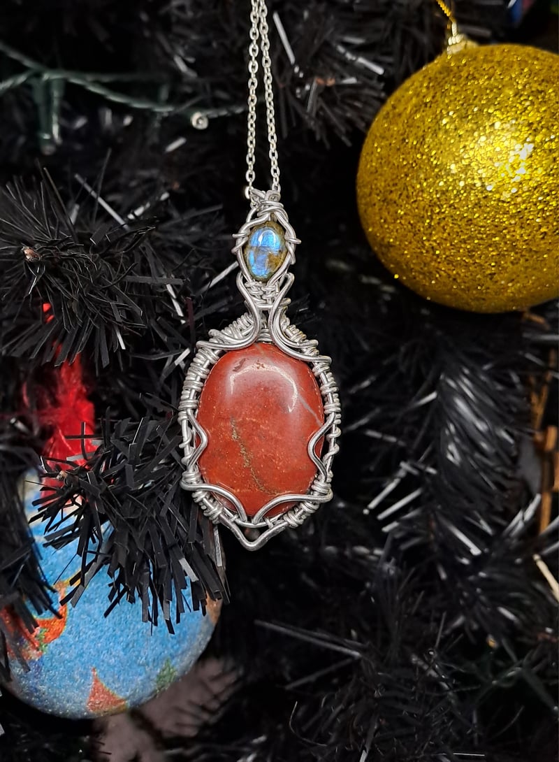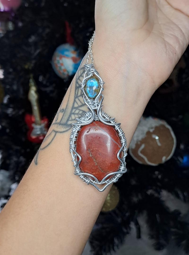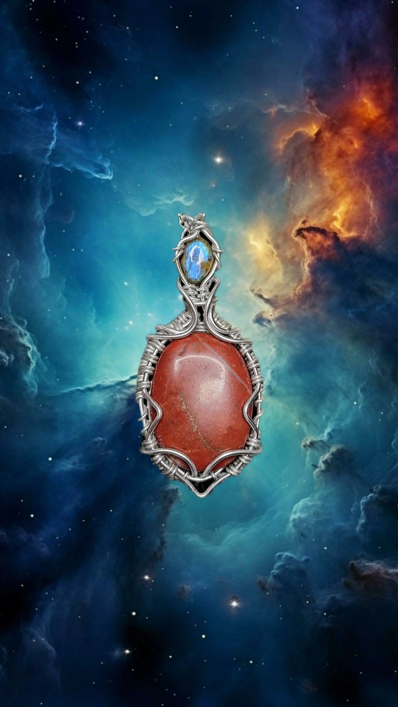 Il rosso acceso del diaspro che punta al petto, come un'iniezione di coraggio e forza, e una goccia azzurra di labradorite, che ci ricorda di sognare, ma senza illusioni.
