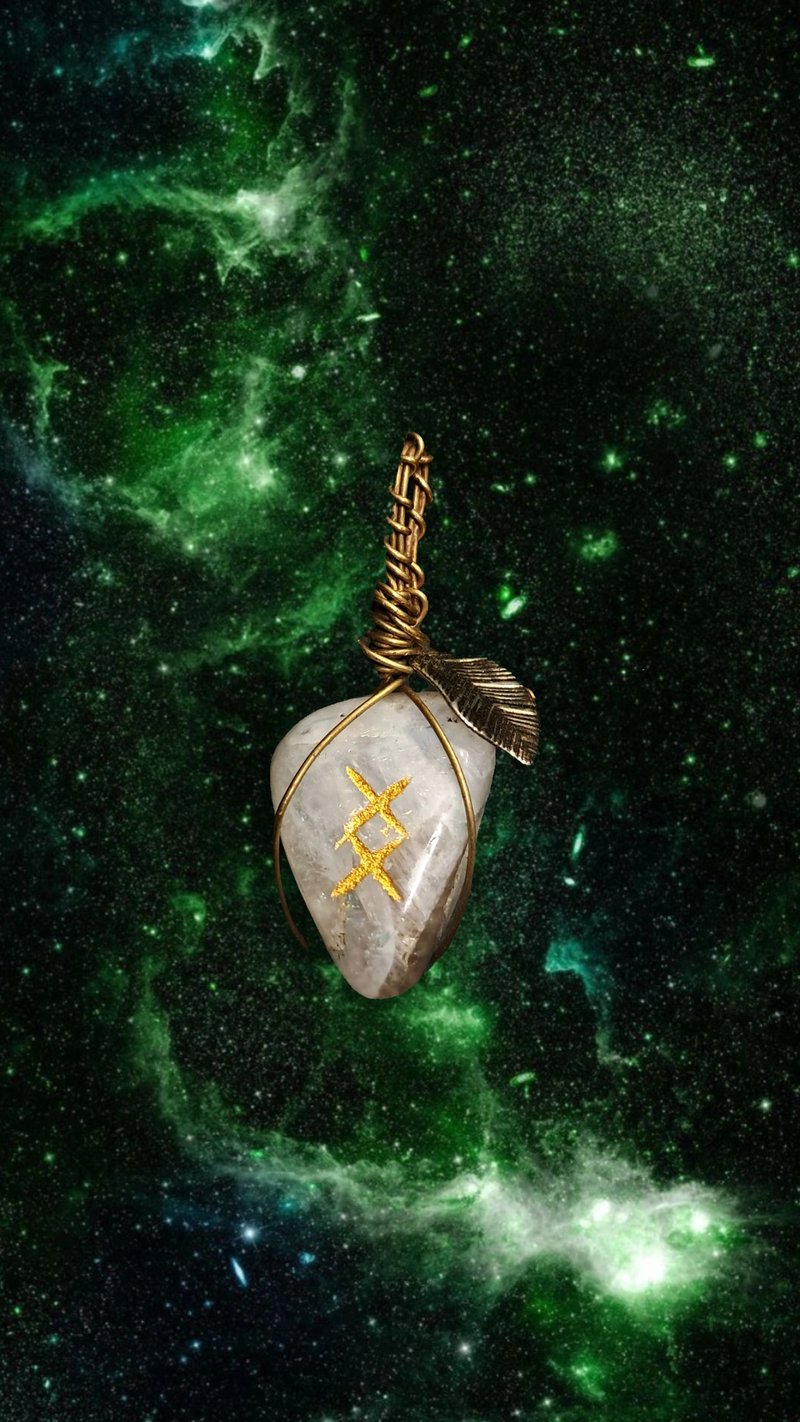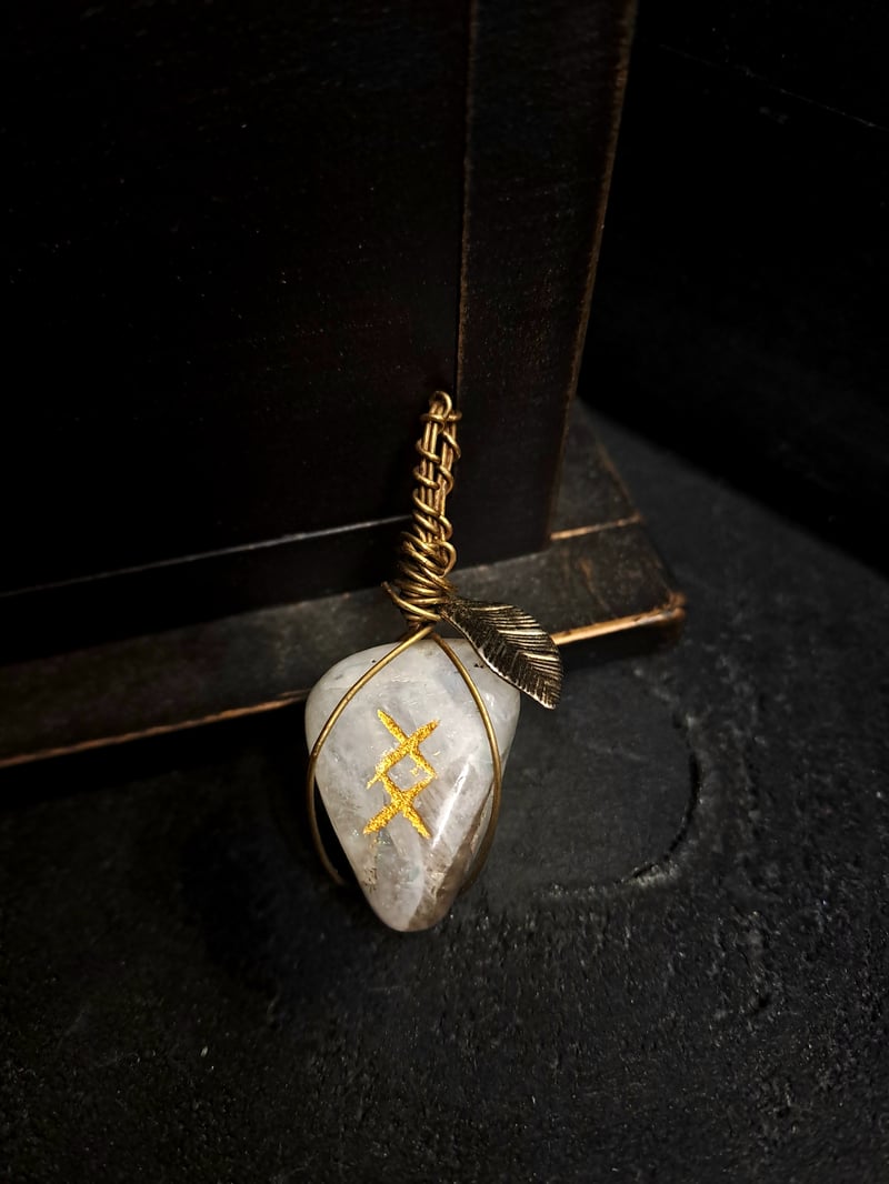 Una labradorite bianca su cui è incisa una runa celtica, incastonata artigianalmente con filo di ottone, con una piccola piuma dorata per un tocco selvaggio.