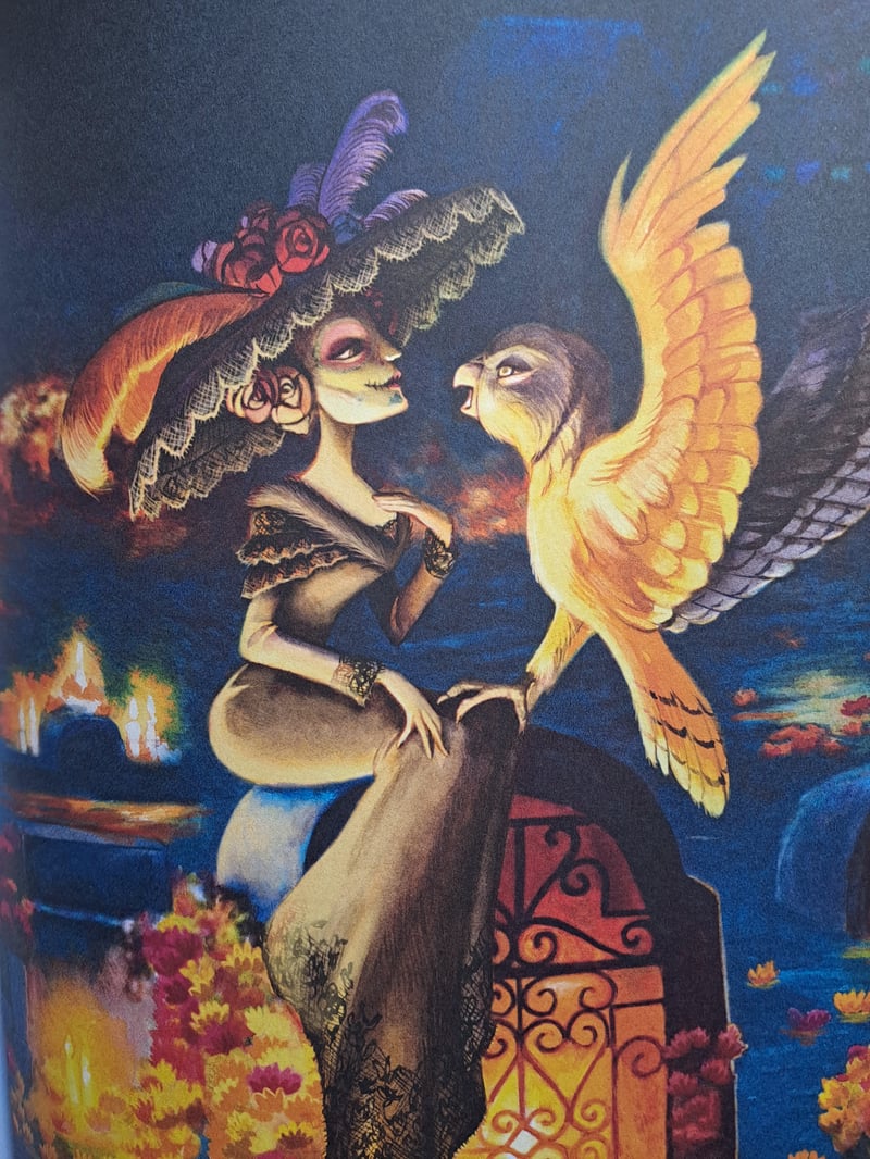 "Tutti corrono a rifugiarsi nei villaggi, abbandonando i doni che avevano portato per onorare i morti. Vestita come una regina, la Santa Muerte sorvola i vicoli. Il suo sguardo si posa qua e là, sulle tombe ricoperte di fiori zuppi.