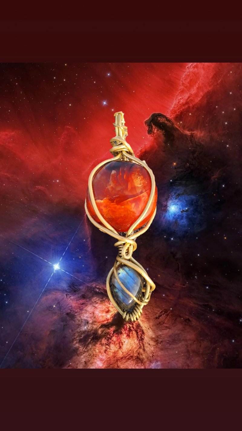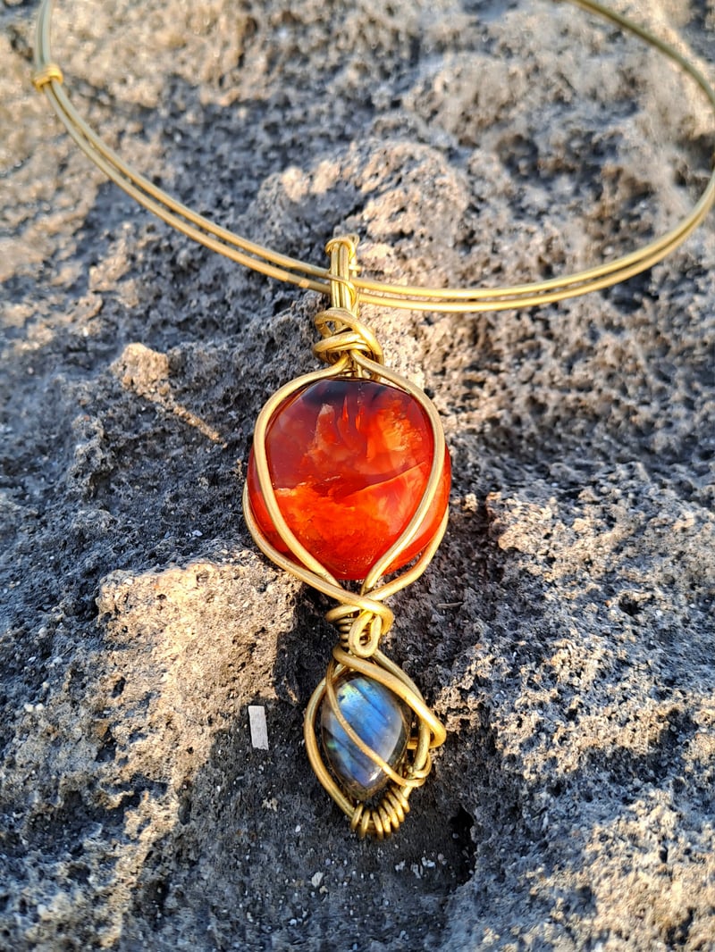 Due pietre che si uniscono: una calda e focosa corniola e la fredda e misteriosa labradorite. Si stringono in un incantevole abbraccio tra fili di ottone.