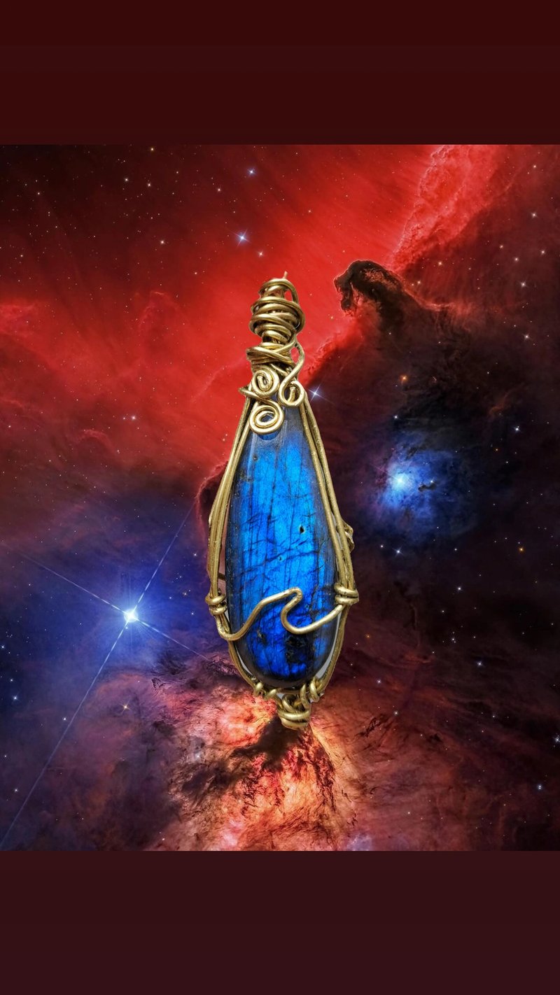 Una leggiadra onda che attraversa l'oceano contenuto in questa meravigliosa labradorite blu, incastonata con fili di ottone.